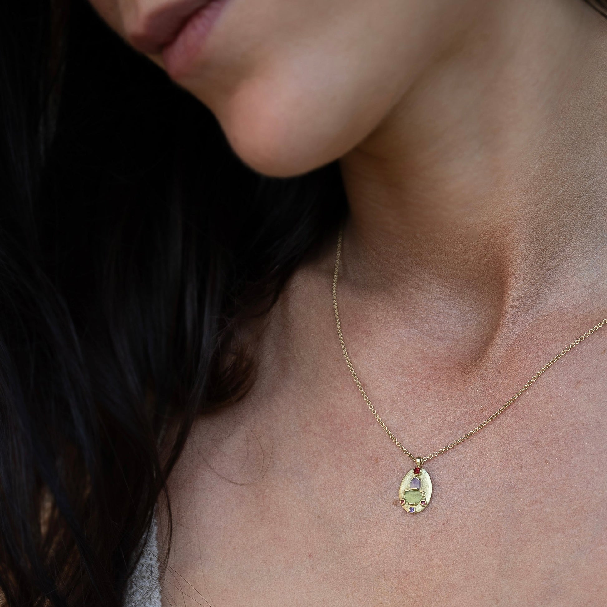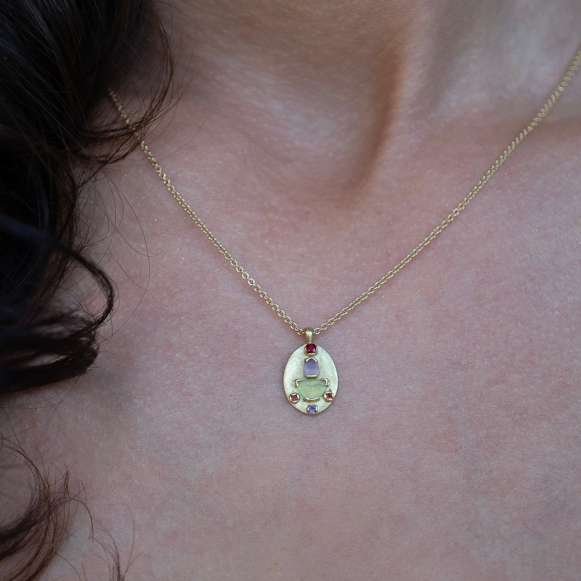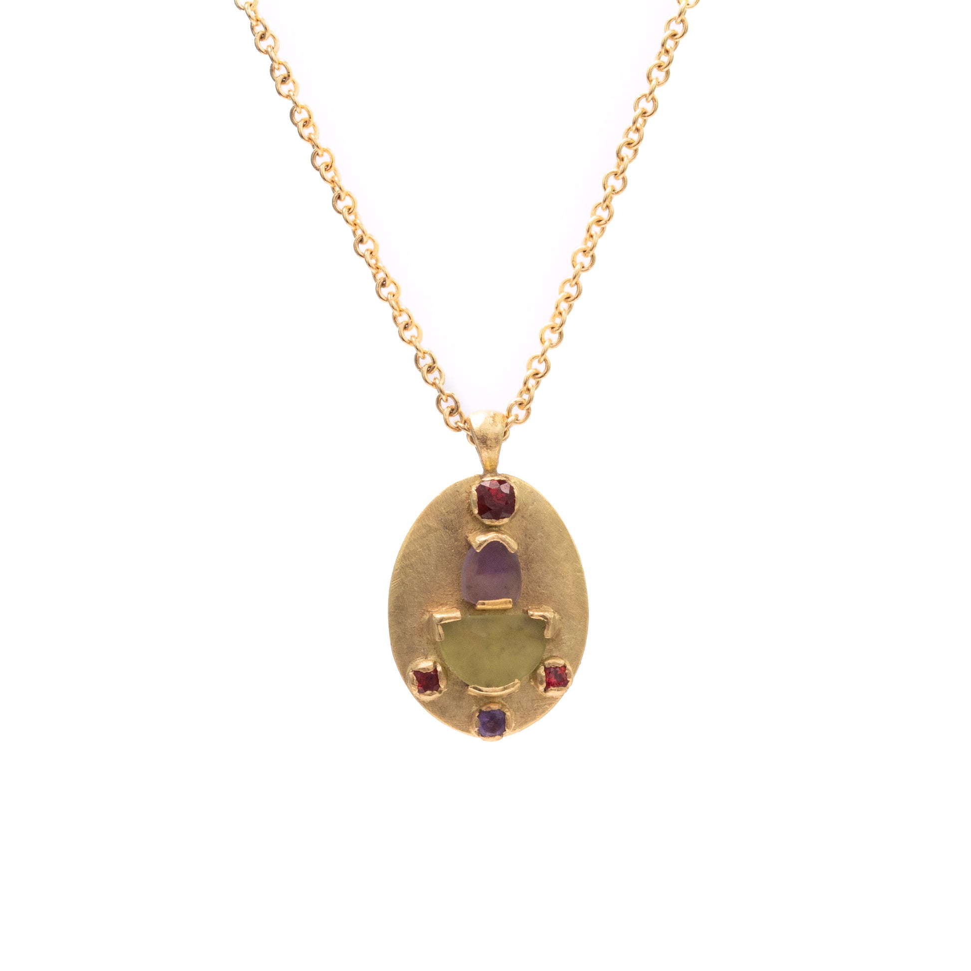 The Azita oval Pendant blends ancient techniques with modern design. Handcrafted from recycled 18ct gold, it features hand-cut peridot and amethyst and faceted, sparkly amethyst and red sapphire side stones—each material selected for its vivid beauty and rich symbolism, forming a pretty palette of complementary colours.