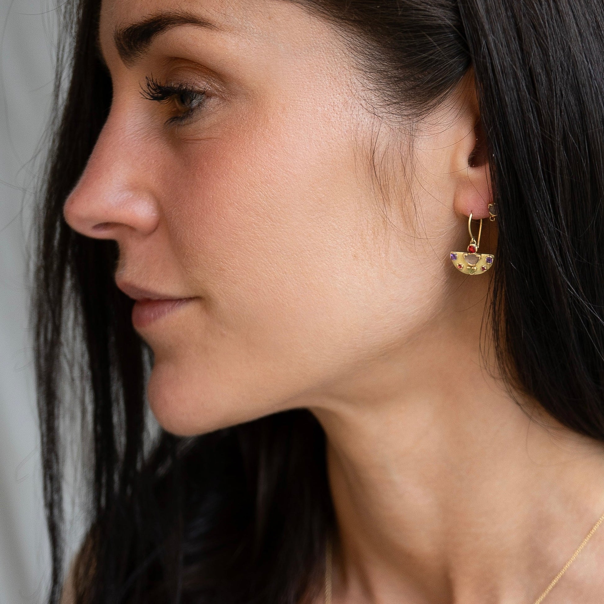 A bold yet intricate expression of timeless elegance, the Azita earrings fuse ancient craftsmanship with contemporary innovation. Handcrafted from recycled gold, they feature a luminous trio of peridot, amethyst, and red sapphire—each stone carefully chosen for its vivid character and connection to nature.