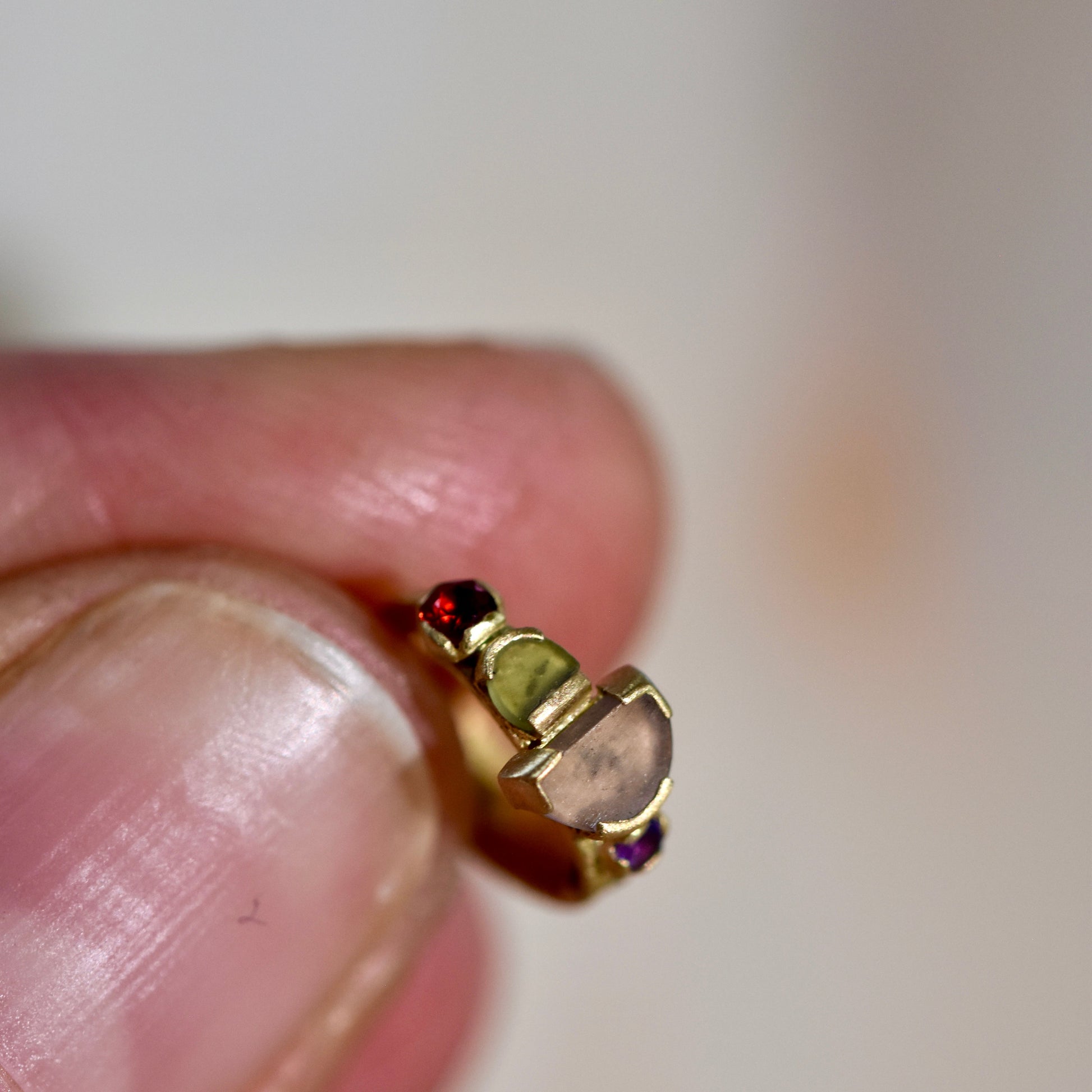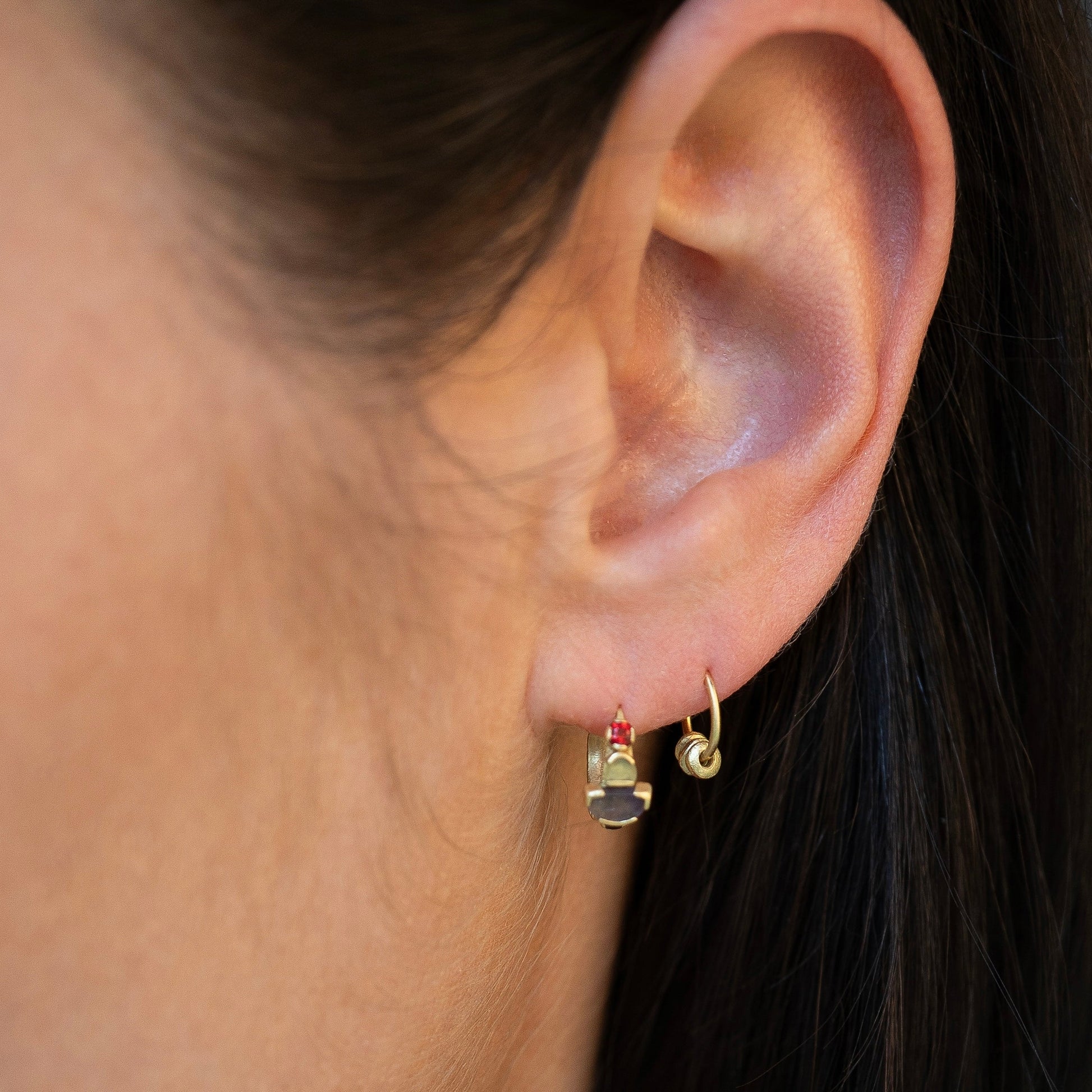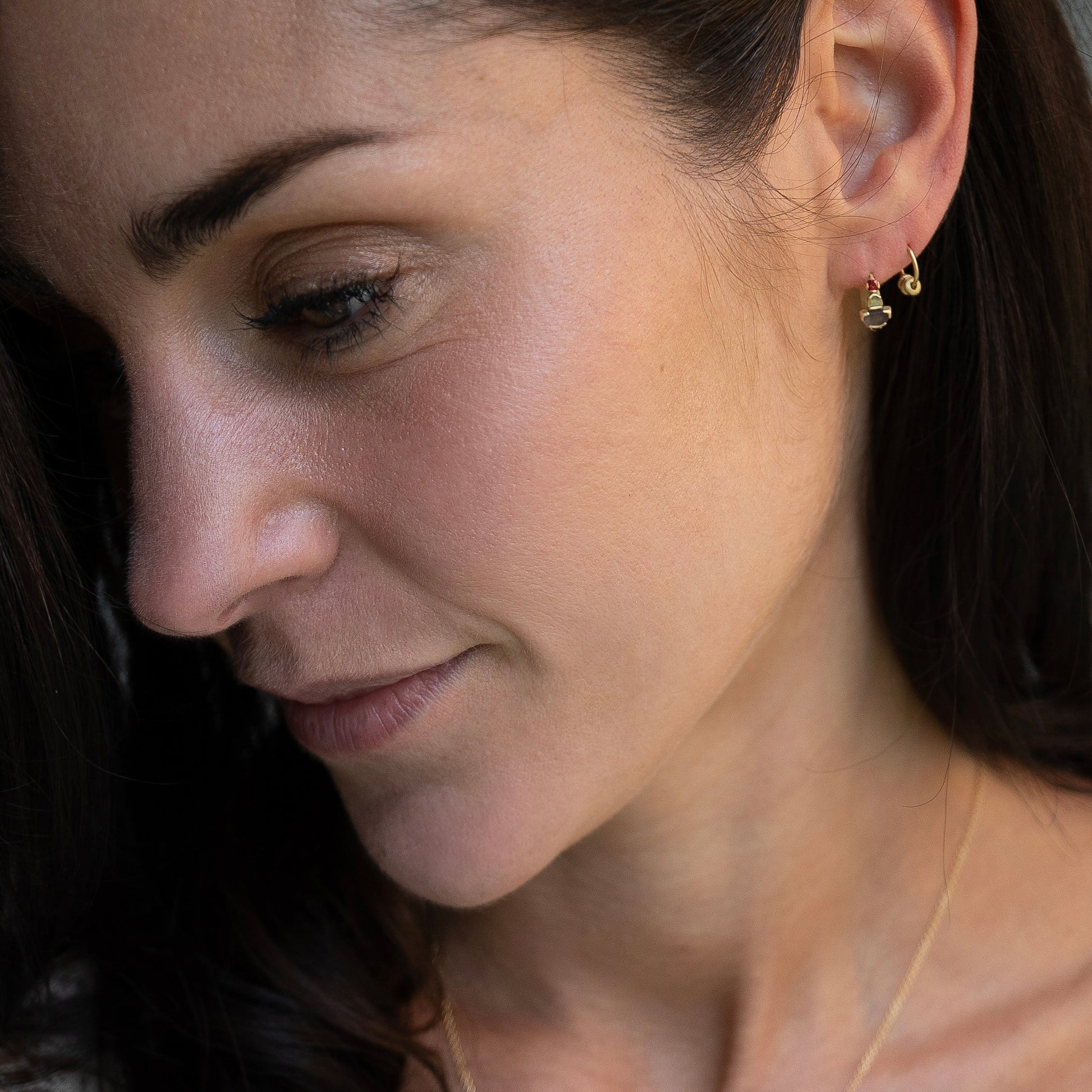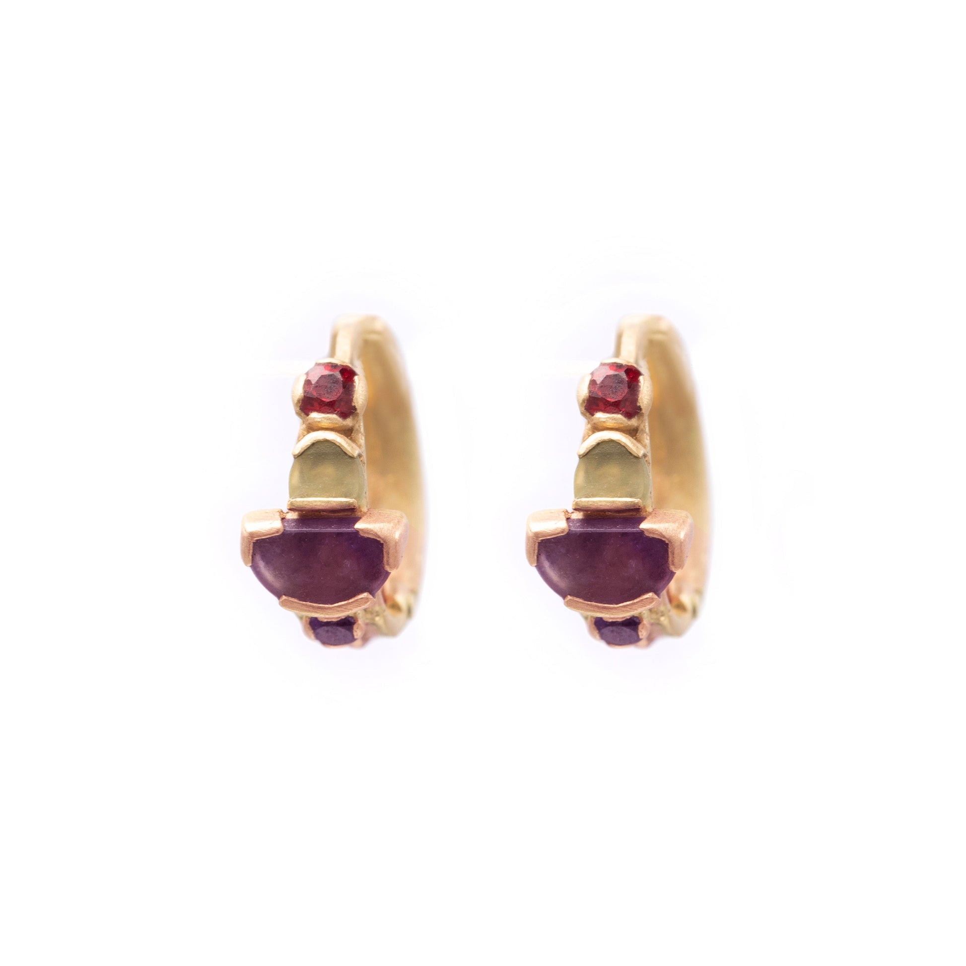 An intricate pair of sleepers that blend ancient techniques with modern, innovative processes. Handcrafted using a combination of peridot, amethyst and red sapphire.