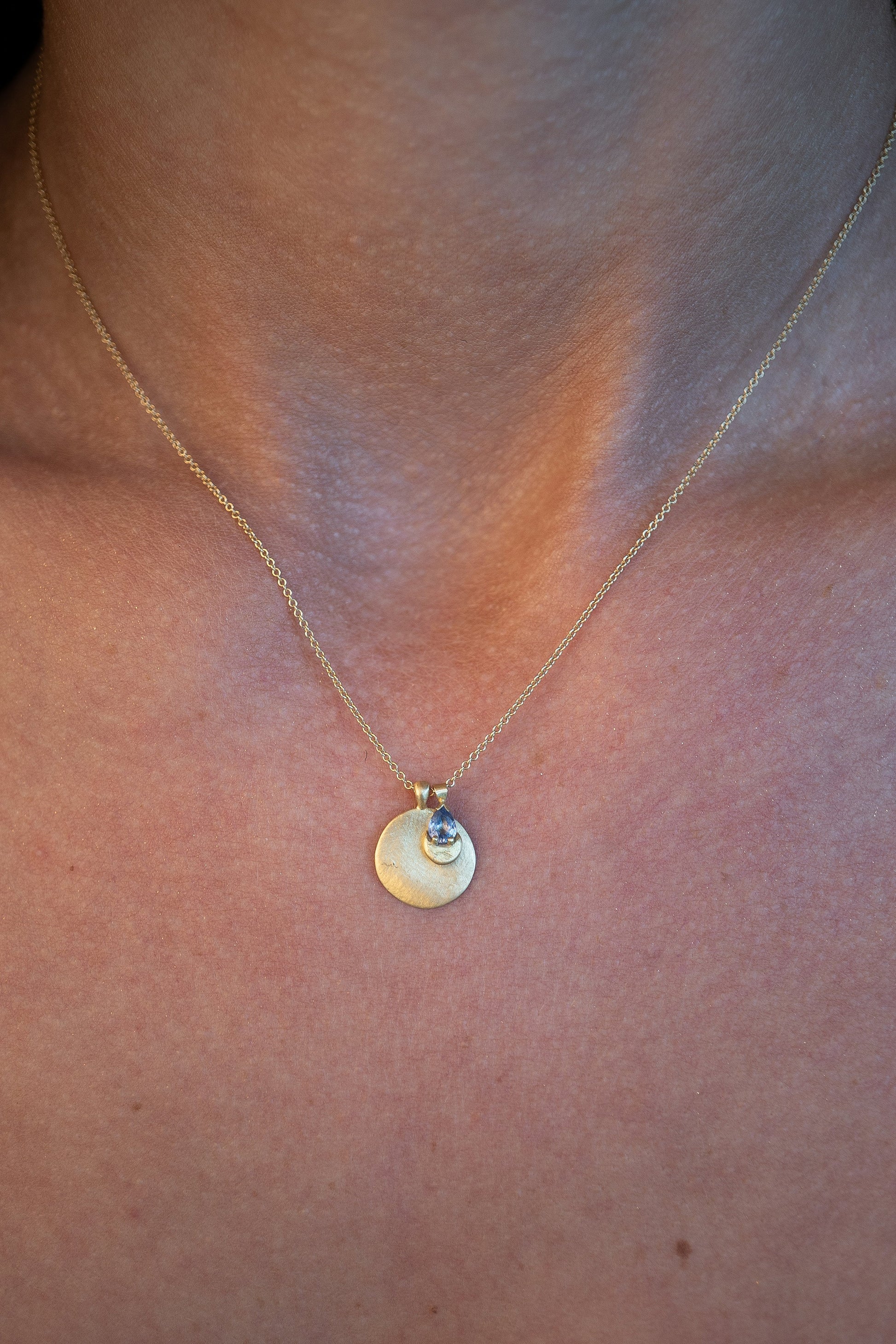 A classic, deep blue, pear-shaped sapphire has been embedded into a softly textured 18K gold arc to create this distinctive, delicate and covetable pendant.