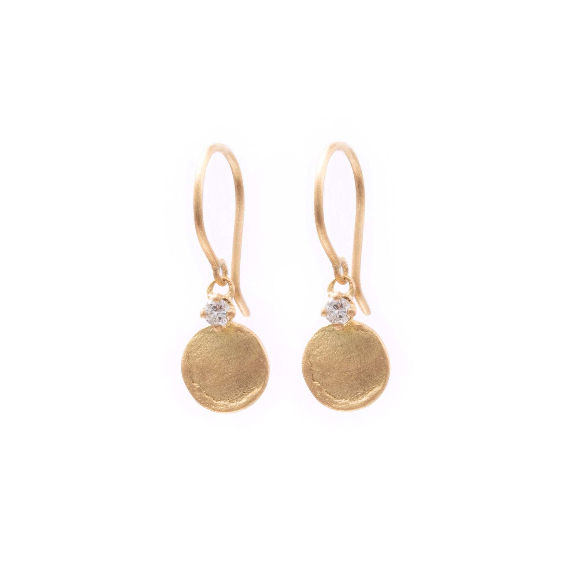 Softly textured, rich gold discs dangle from sparkling diamond studs. These earrings have a magical, playful quality in the way they move and shimmer. These subtly opulent, elegant earrings walk the line perfectly between occasional wear and the everyday .