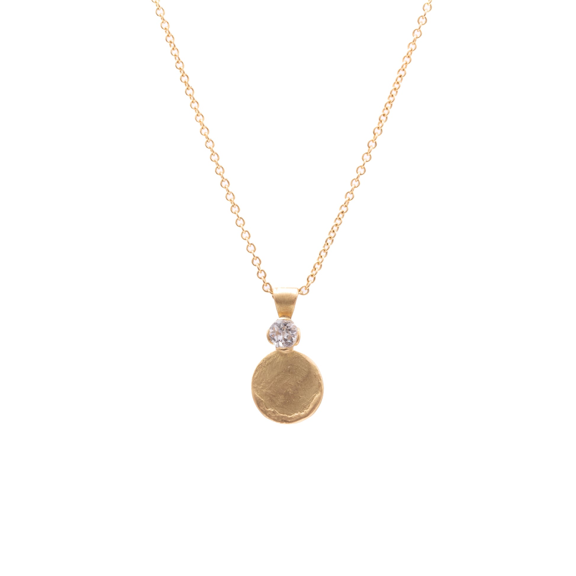 A softly textured, rich 18K gold disc has been teamed with a sparkling diamond to create this stunning, mini pendant packed with character and perfect for everyday.