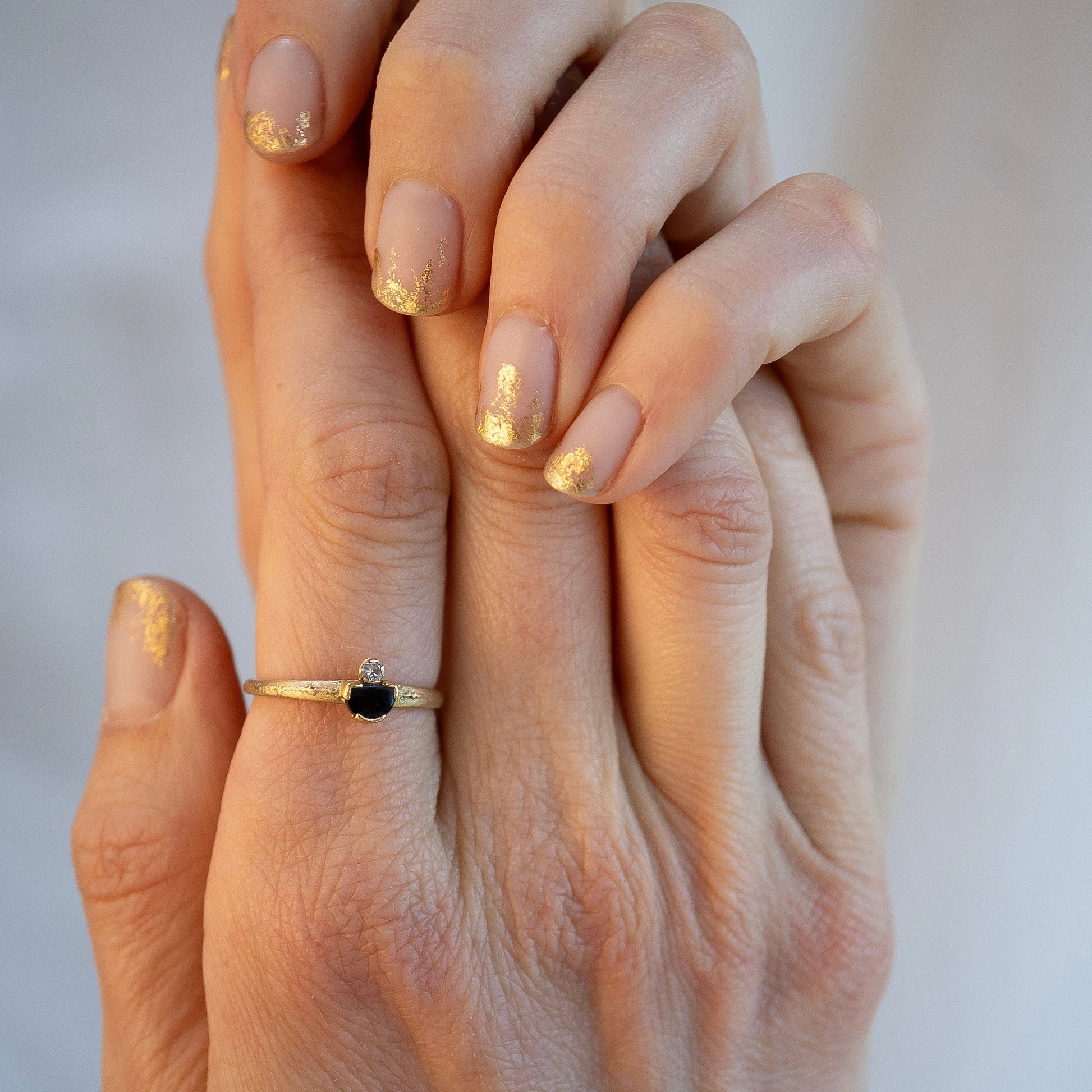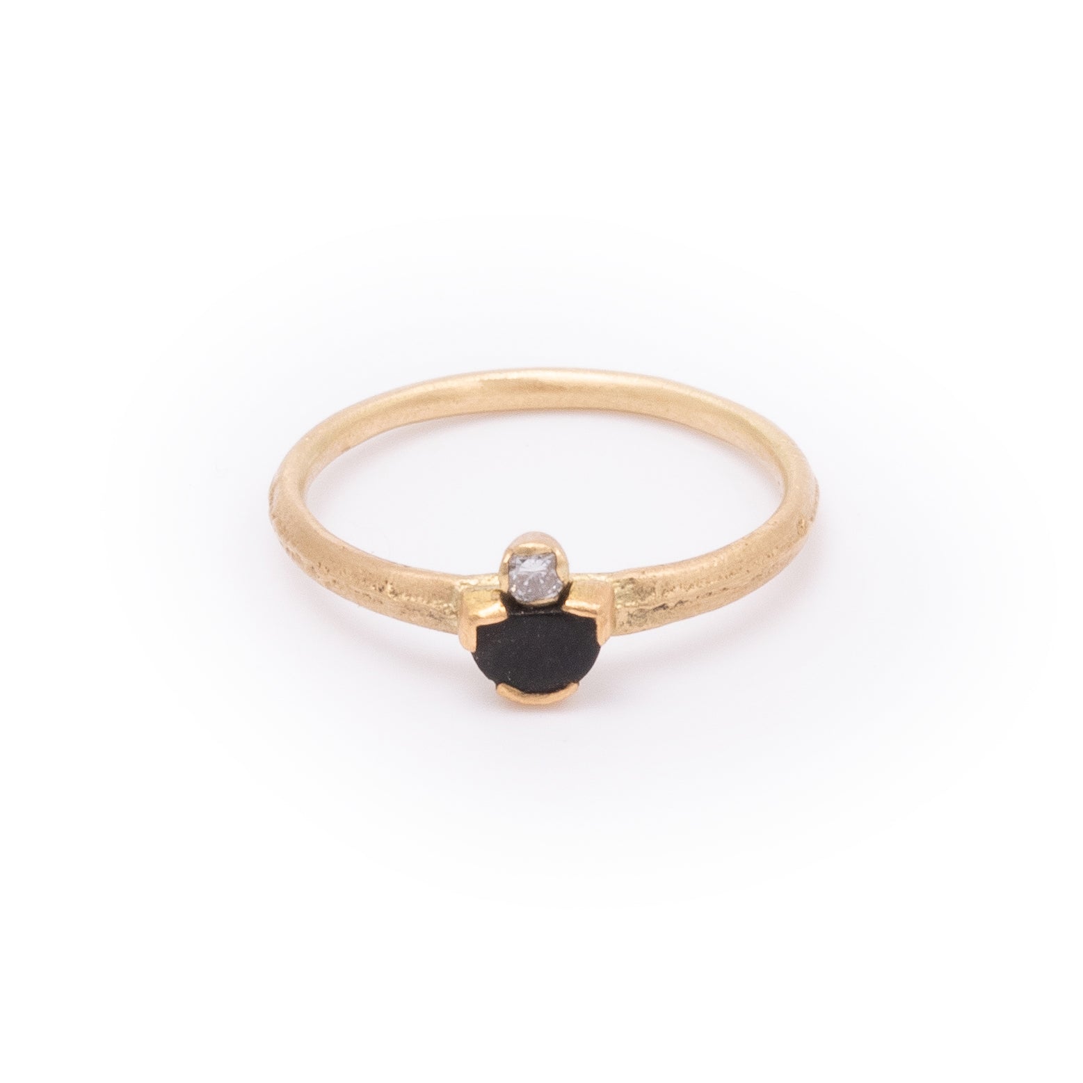 Exquisitely handcrafted, the Little Ettie Ring pairs hand-cut jet with a reclaimed antique diamond—jet evoking the night sky, and the diamond shining like a star. “Ettie,” the Persian word for star, captures the poetic spirit of this celestial-inspired piece.