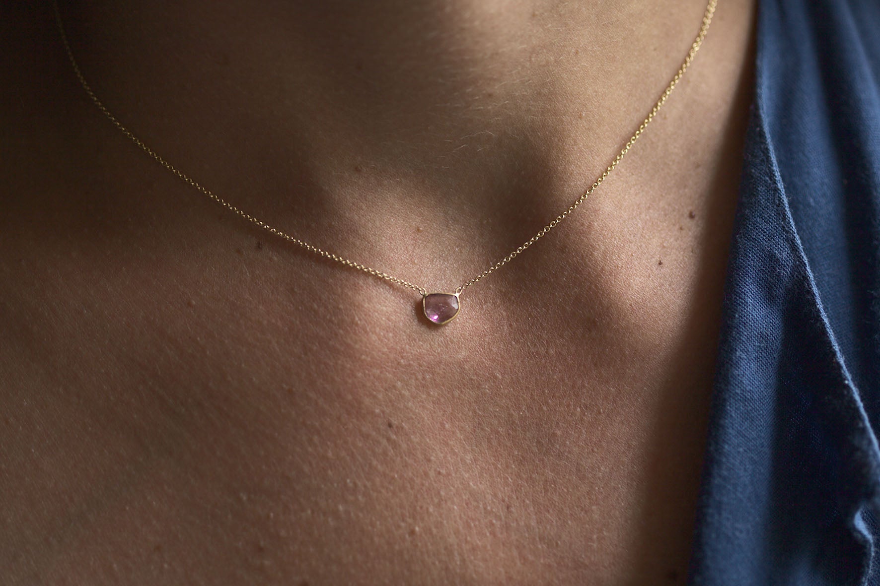 A warm pink asymmetric rose-cut sapphire fixed into a fine 22k setting. The sapphire sits elegantly in between the collarbones, perfect for an everyday piece.