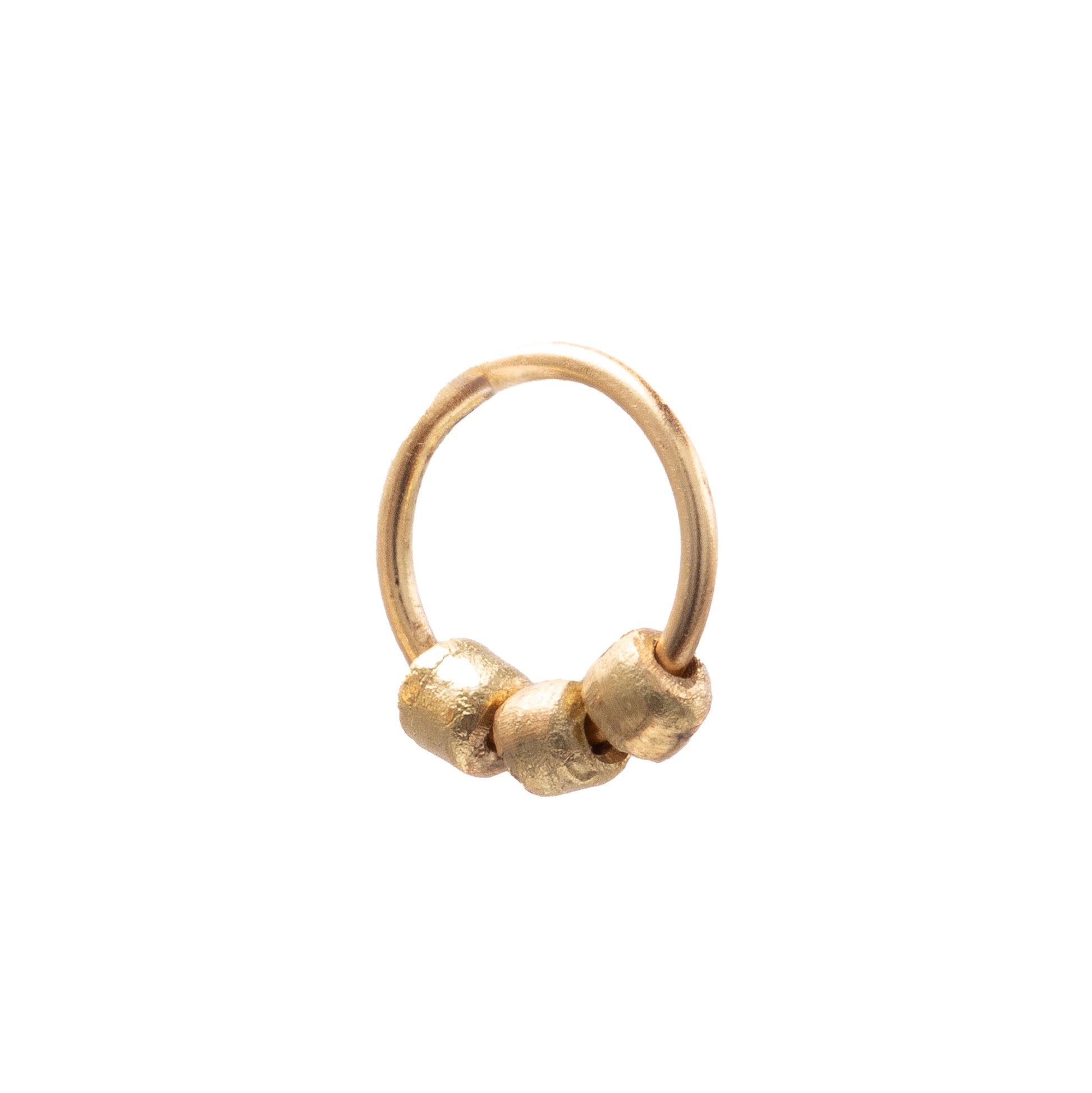 Each features three round gold beads, handmade in wax and cast into recycled gold. The beads have a raw, fingerprint-like texture and they spin freely on the wire hoop, adding subtle movement and character.