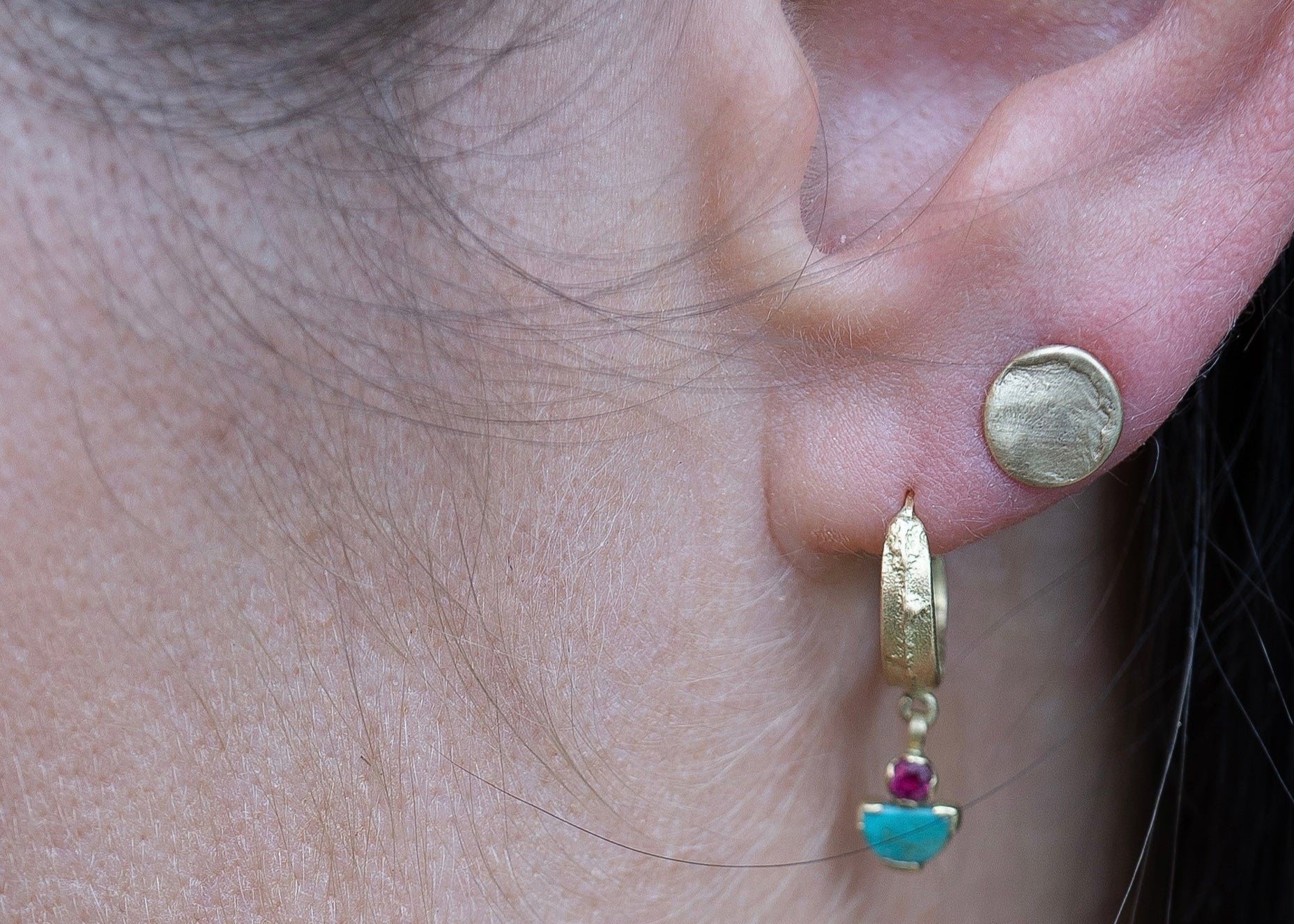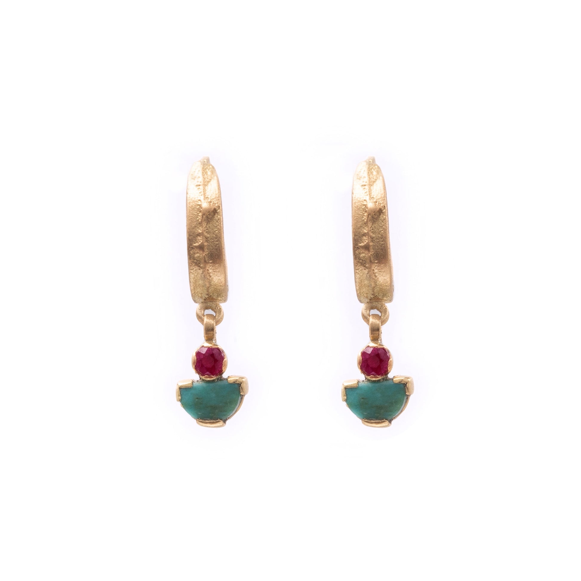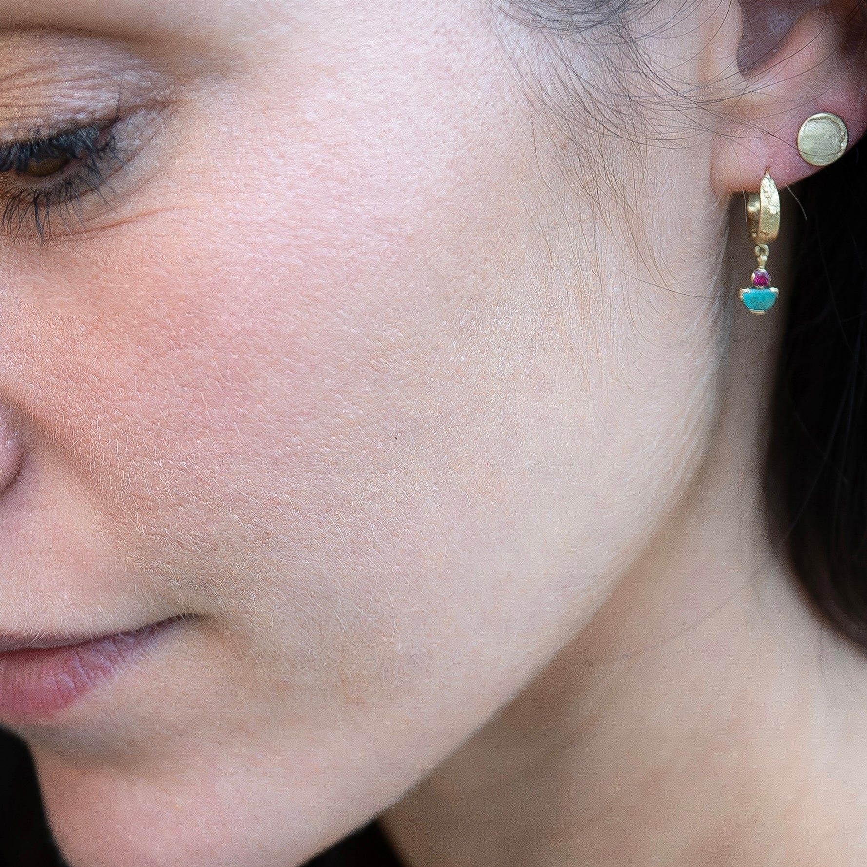 An intricate pair of huggie sleepers that blend ancient techniques with a modern, contemporary aesthetic. Stunning turquoise and ruby charms dangle sweetly below the sleeper.