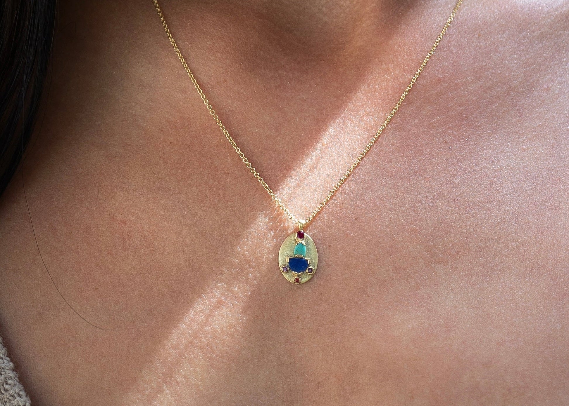 The Tara Pendant blends ancient techniques with modern design. Handcrafted from recycled 18ct gold, it features turquoise, lapis lazuli, rubies, and orange sapphires—each stone selected for its vivid beauty and rich symbolism, forming a vibrant palette of complementary colours.